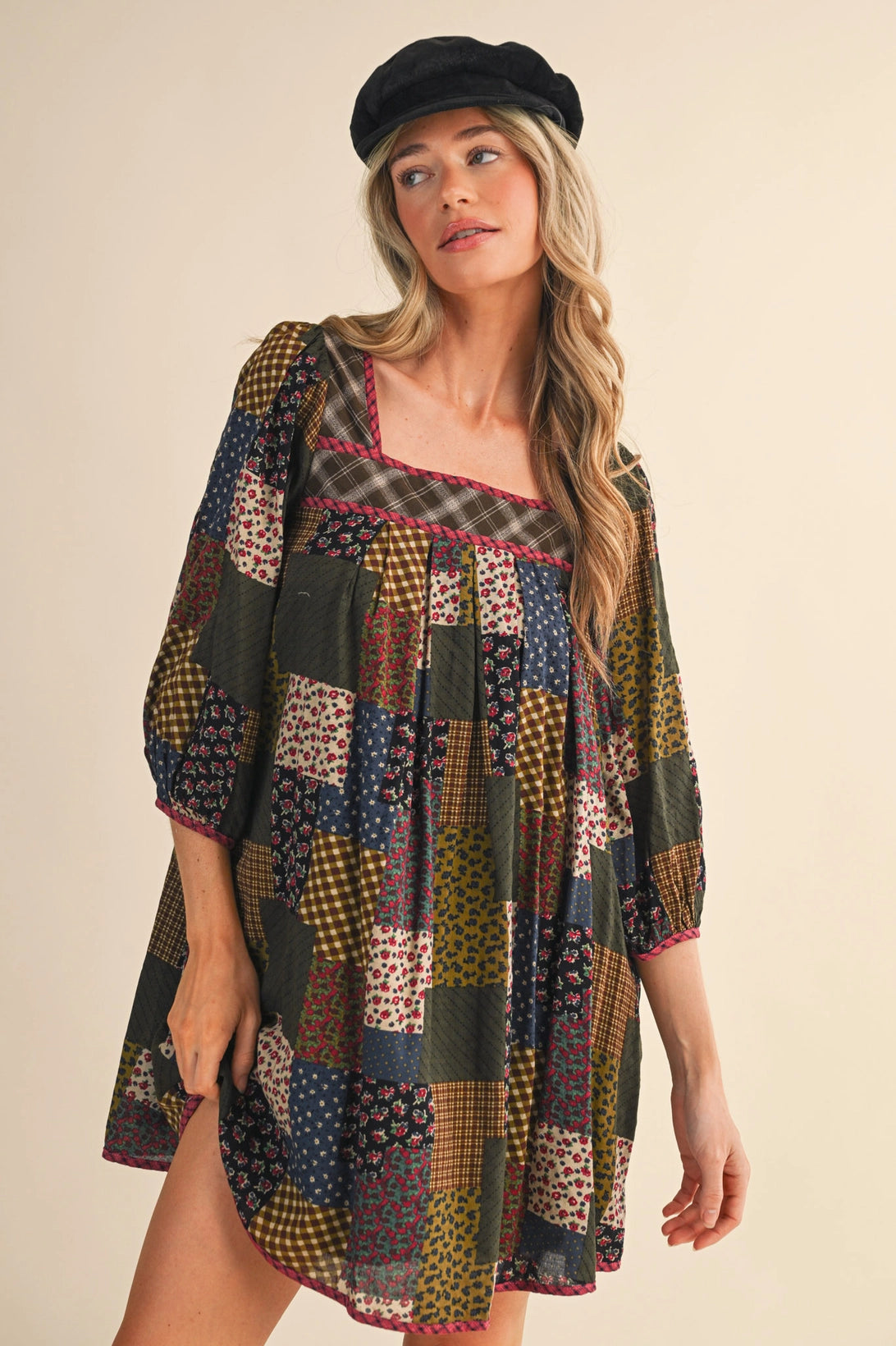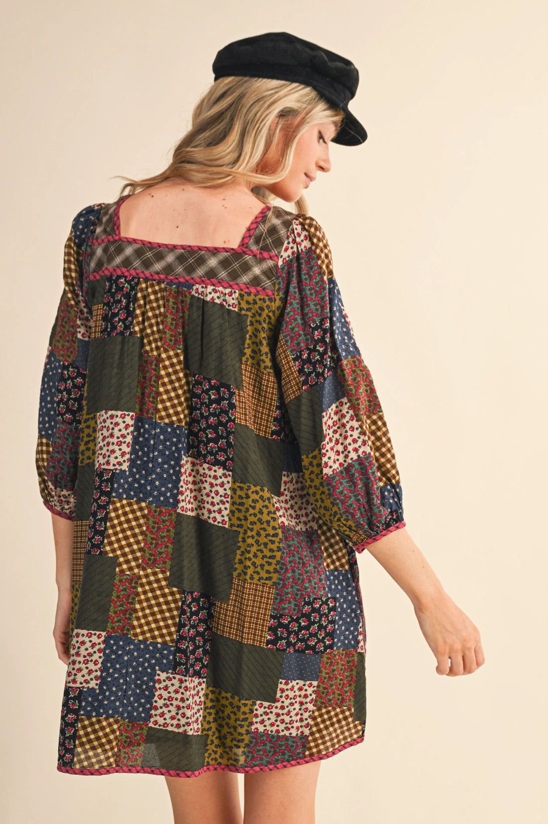 + Mixed patch print mini dress + Square neckline + Contrast binding neckline + 3/4 length puff sleeves with contrast binding cuffs