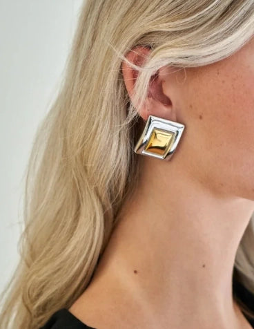 steel, hypoallergenic. Light weight. Surgical Steel post and back. Gold plated and high shine silver plated inlay technique. Curve to the earring allows it to sit comfortably Hypoallergenic Lead Free Nickel Free.